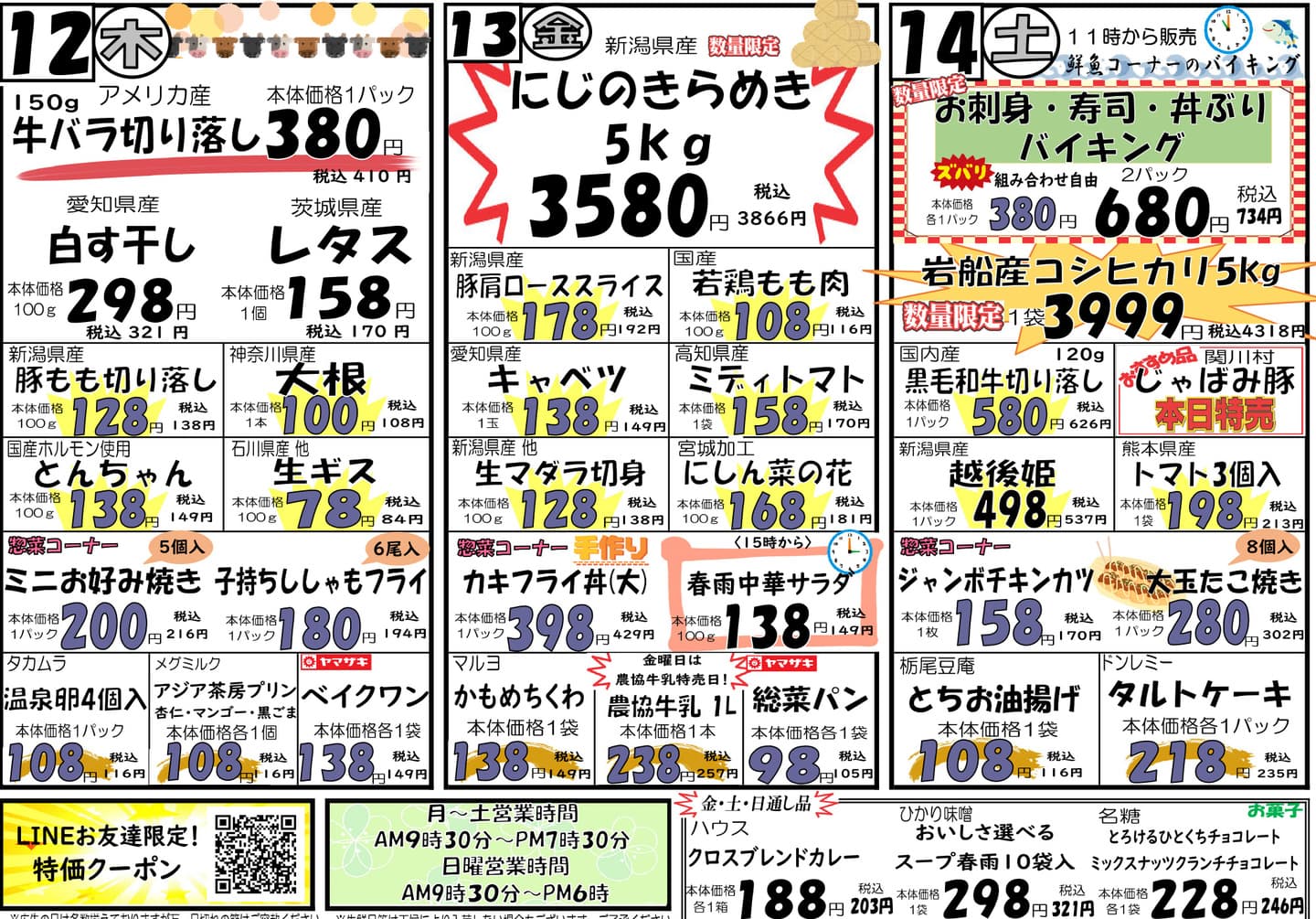 FLYER 最新チラシ ※チラシの画像をおすと大きくチラシを見ることができます。 3/9(月)~3/11(水)チラシ 大きくチラシを見る 3/12(木)~3/14(土)チラシ 大きくチラシを見る LINE LINE友だち募集中 最新チラシやお得情報が届きます! 友だち登録感謝クーポン配信中 ご予約、お問い合わせもLINEから \友だち登録クーポン配信中/