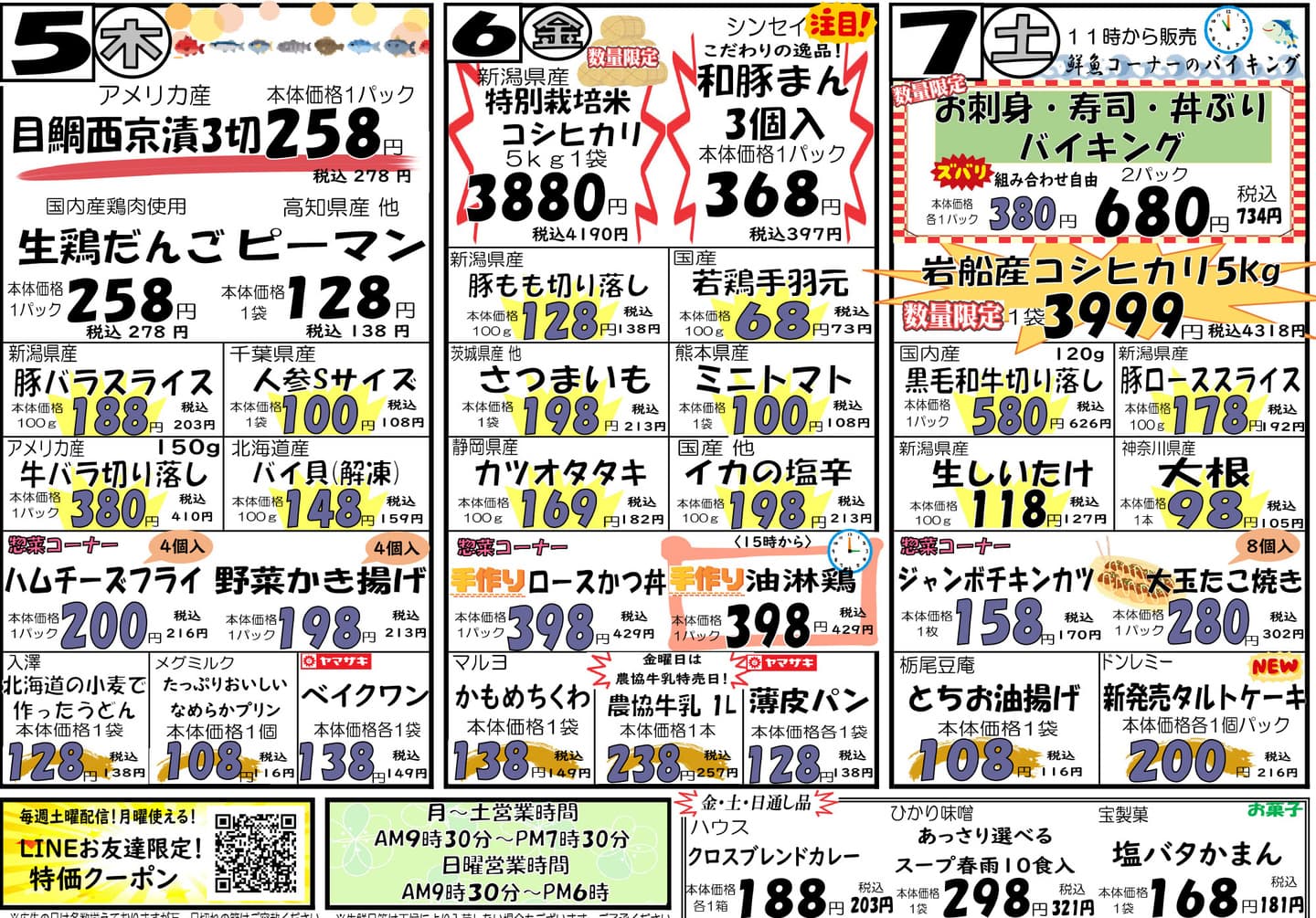 FLYER 最新チラシ ※チラシの画像をおすと大きくチラシを見ることができます。 2/2(月)~2/4(水)チラシ 大きくチラシを見る 2/5(木)~2/7(土)チラシ 大きくチラシを見る LINE LINE友だち募集中 最新チラシやお得情報が届きます! 友だち登録感謝クーポン配信中 ご予約、お問い合わせもLINEから \友だち登録クーポン配信中/