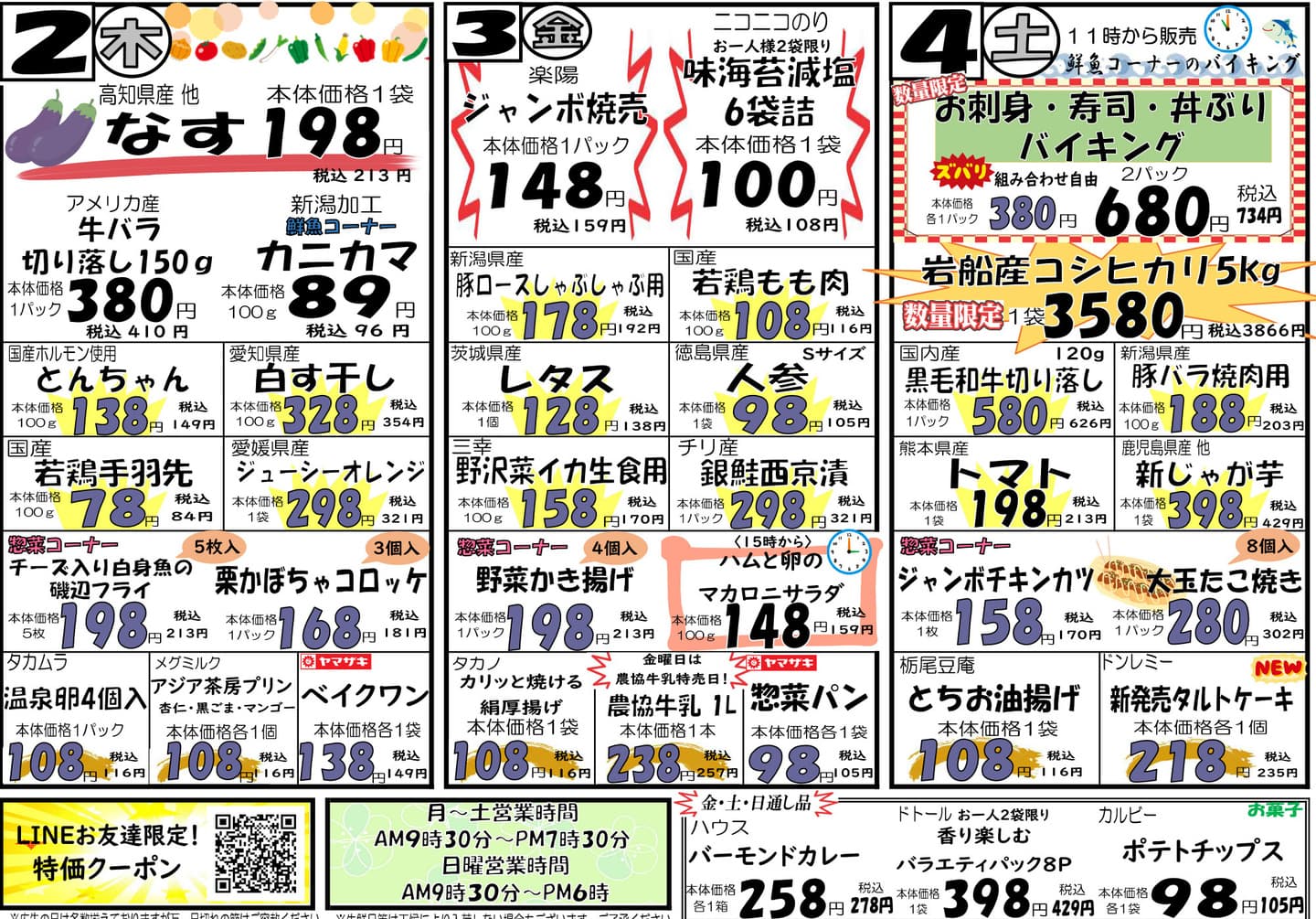 FLYER 最新チラシ ※チラシの画像をおすと大きくチラシを見ることができます。 3/30(月)~4/1(水)チラシ 大きくチラシを見る 4/2(木)~4/4(土)チラシ 大きくチラシを見る LINE LINE友だち募集中 最新チラシやお得情報が届きます! 友だち登録感謝クーポン配信中 ご予約、お問い合わせもLINEから \友だち登録クーポン配信中/