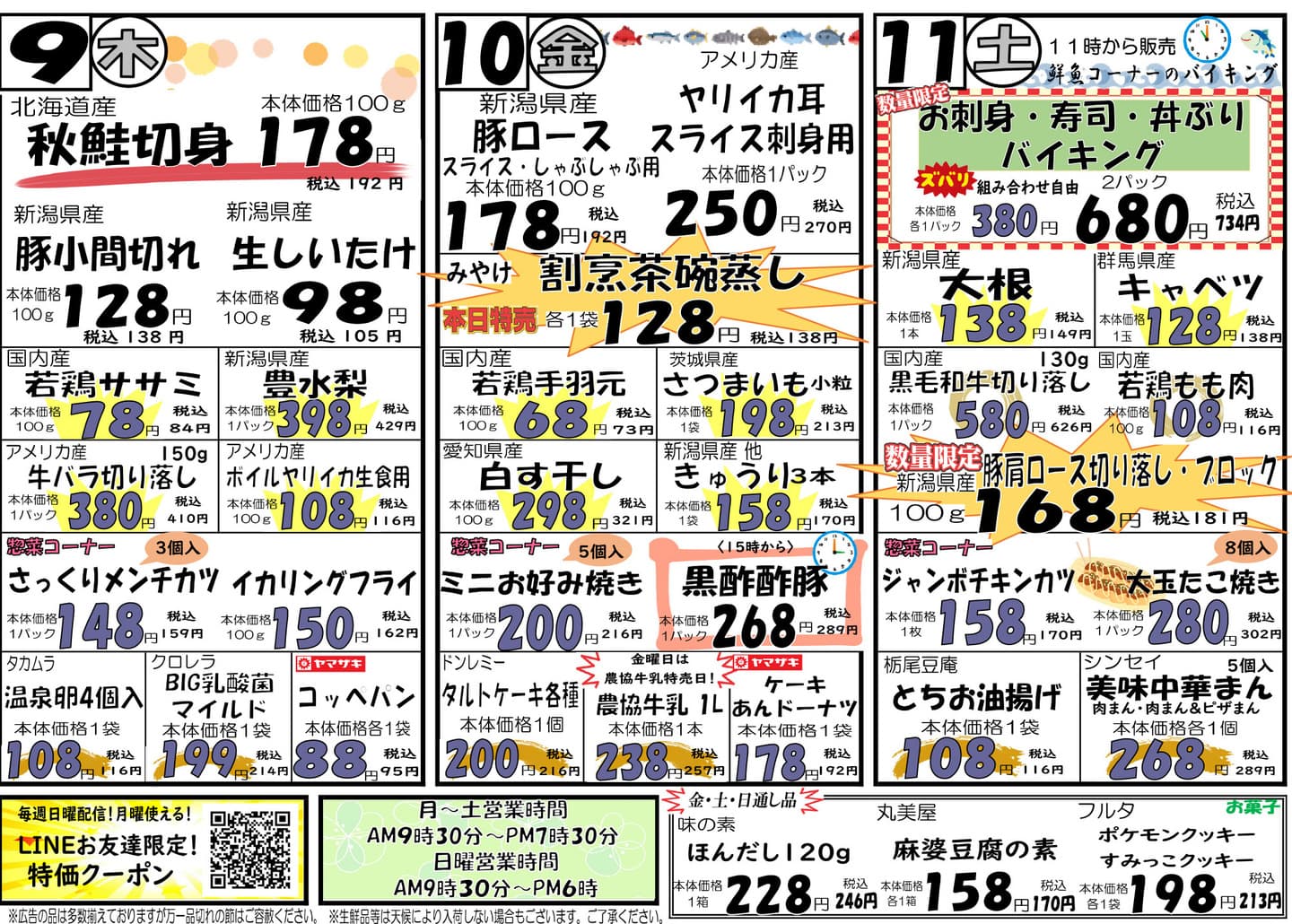 FLYER 最新チラシ ※チラシの画像をおすと大きくチラシを見ることができます。 10/6(月)~10/8(水)チラシ 大きくチラシを見る 10/9(木)~10/11(土)チラシ 大きくチラシを見る LINE LINE友だち募集中 最新チラシやお得情報が届きます! 友だち登録感謝クーポン配信中 ご予約、お問い合わせもLINEから \友だち登録クーポン配信中/